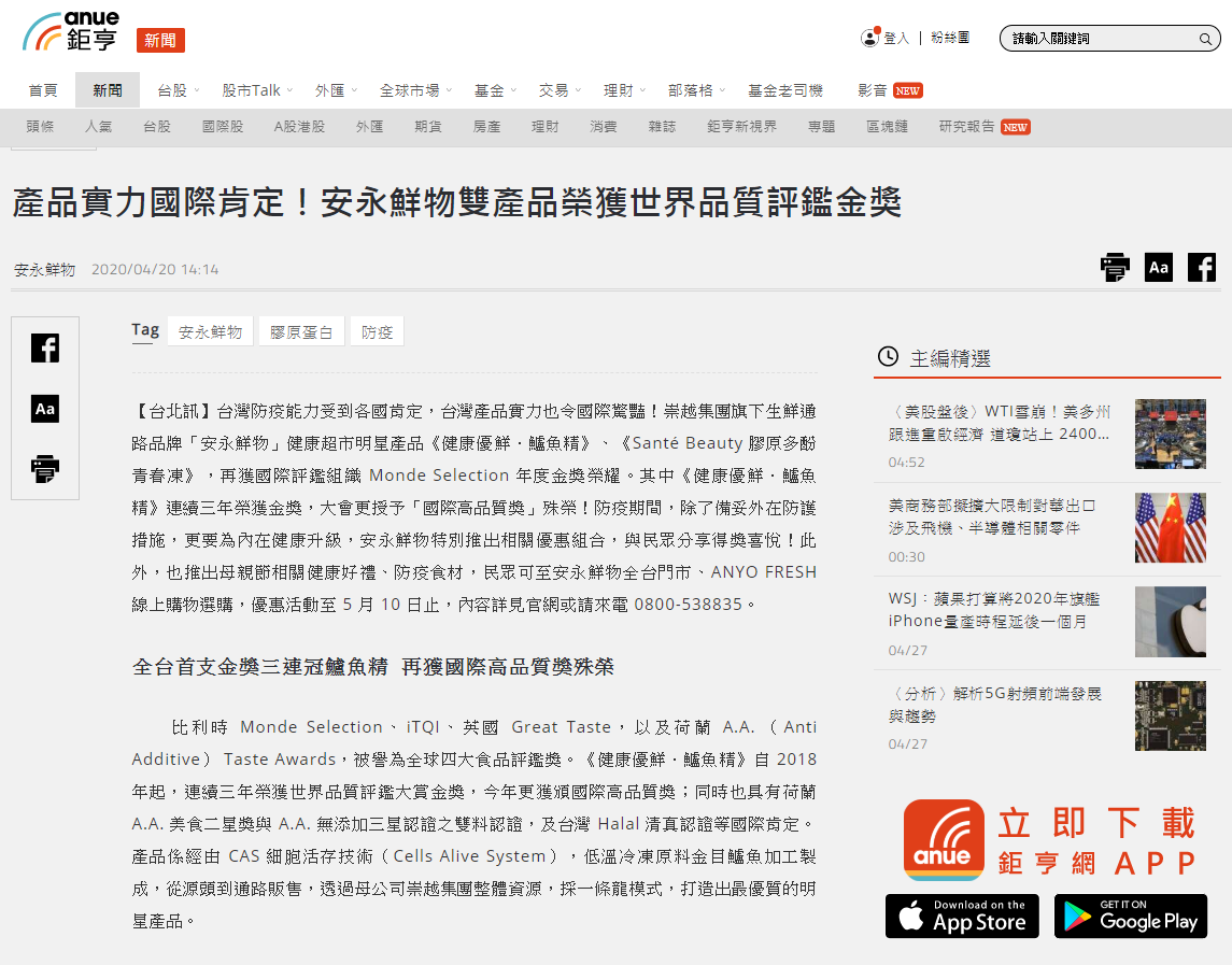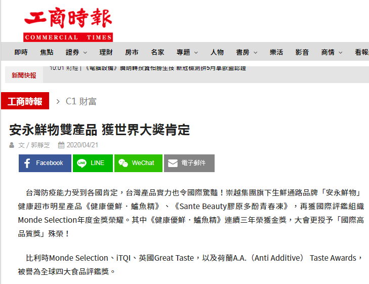 [媒體報導]產品實力國際肯定!安永鮮物雙產品榮獲世界品質評鑑金獎