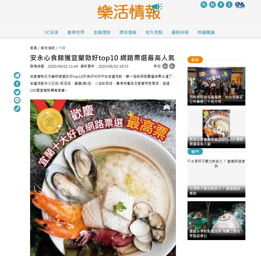 [媒體報導]安永心食館獲宜蘭勁好top10 網路票選最高人氣