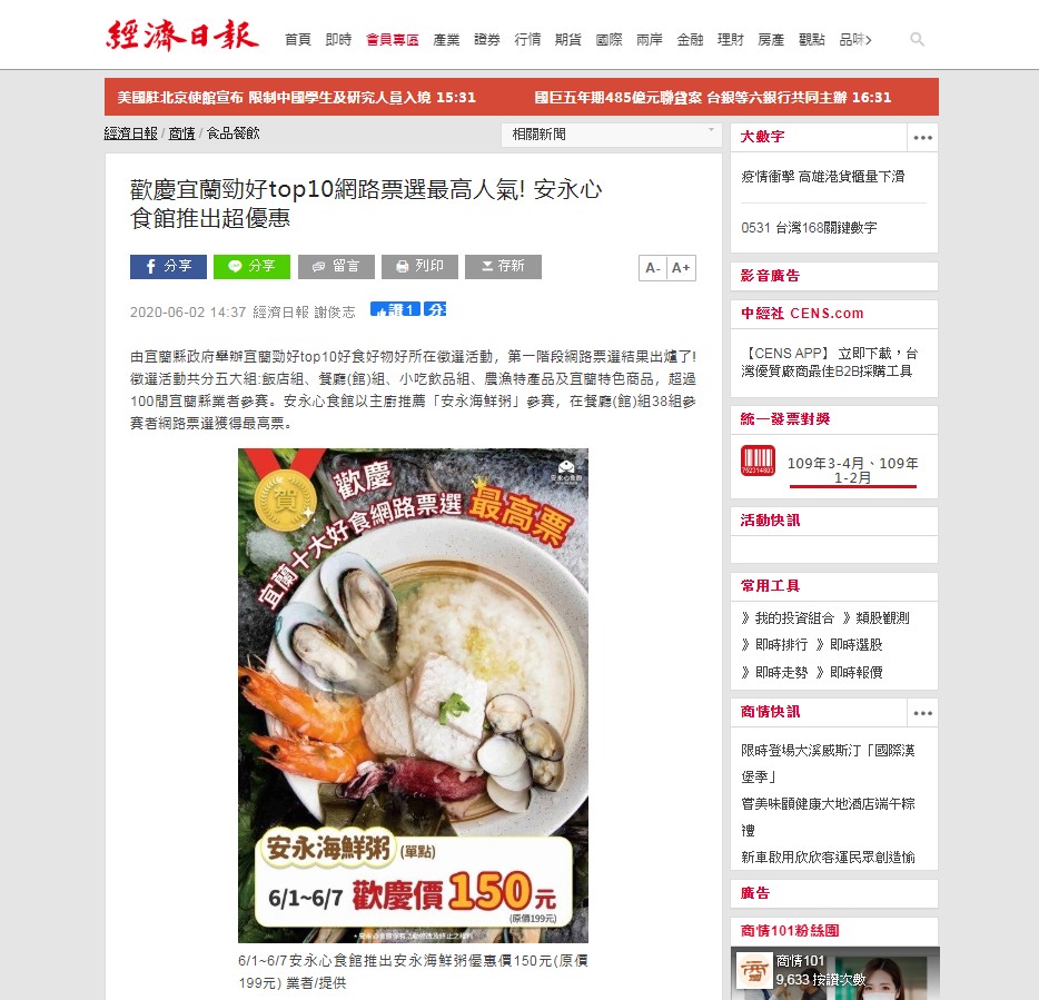 [媒體報導]歡慶宜蘭勁好top10網路票選最高人氣! 安永心食館推出超優惠