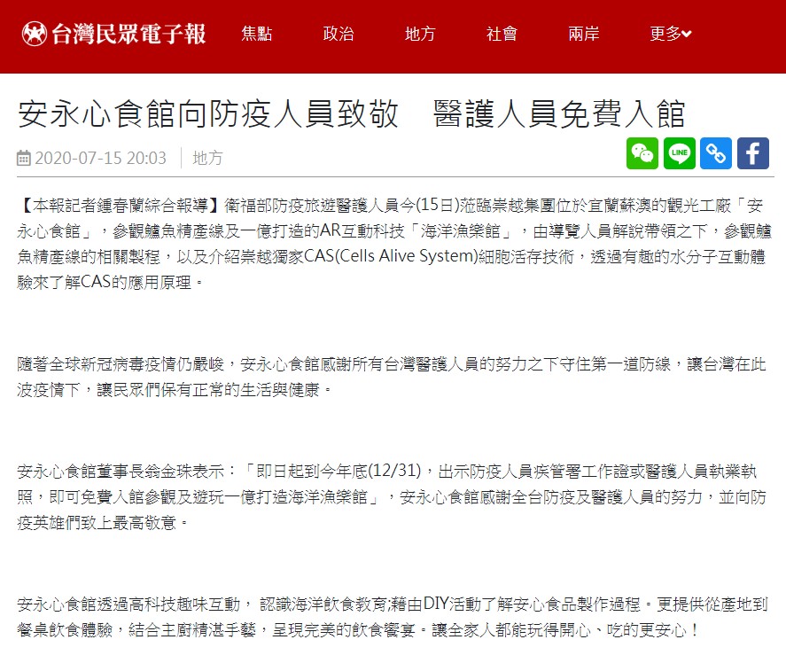 [媒體報導]安永心食館向防疫人員致敬 醫護人員免費入館