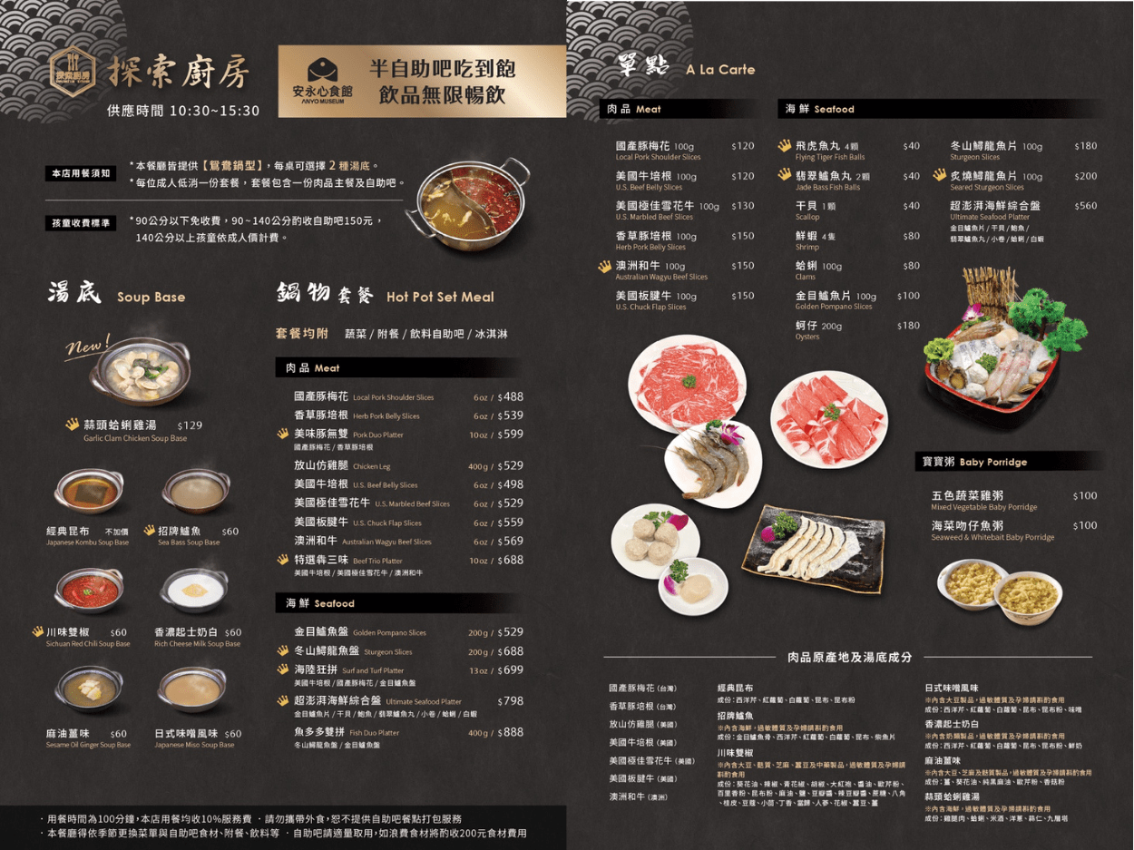 • 用餐時間為100分鐘,用餐均收10%服務費