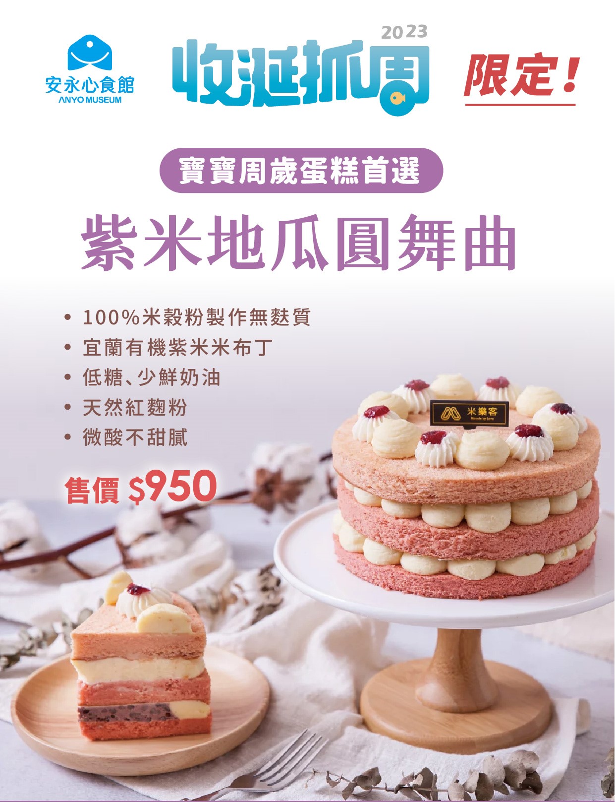 寶寶周歲蛋糕首選,100%米穀粉製作無麩質、宜蘭有機紫米米布丁、天然紅麴粉、低糖、少鮮奶油、微酸不甜膩。